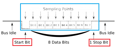 비동기 통신이므로 동기 신호가 전달되지 않아 수신 쪽에서 동기신호를 찾아내 데이터의 시작과 끝을 시간적으로 알아 처리할 수 있도록 약속되어 있다.