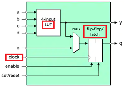 즉, 순차적인 기능을 수행하는 등 Timing 에 관련된 부분에서 Flip-Flop 을 사용하기 때문에 FPGA 에는 보통 LUT 끝에 Flip-Flop 이 달려있다.
