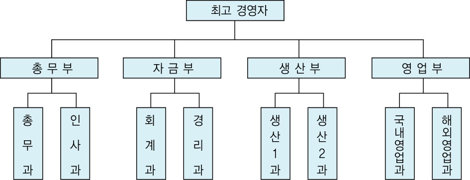 - 라인 조직 : 최고 경영자를 정점으로 기업을 핵심 경영 기능에 따라 단위 조직으로 세분화한 형태