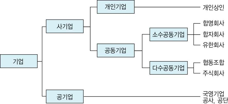 사기업은 개인기업과 공동기업 으로 나뉘며, 개인기업은 개인 상인을 의미한다.