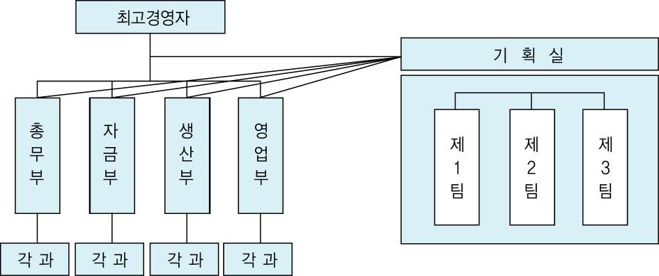 - 라인-스텝 조직 : 기능별 라인 조직에 전체적인 조정 역할을 담당하는 기획실등의 스텝조직을 추가한 형태