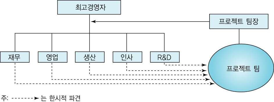 - 프로젝트 조직 : 기존 조직으로 부터 파견 형식으로 필요한 인력을 모은 후 독립적인 프로젝트 팀을 구성하는 형태