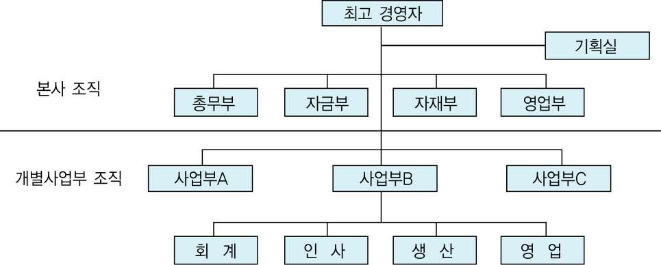 - 사업부제 조직 : 기증별 조직에 여러개의 사업부 조직을 결합한 형태