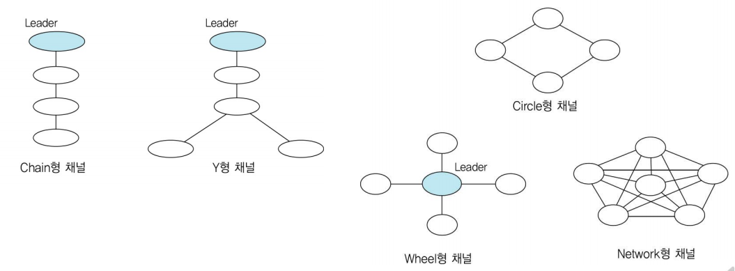 채널의 형태에는 하향식, 상향식, 수평식이 있으며, 유형에는 Chain형, Y형, Circle형, Wheel형, Network형이 있다.