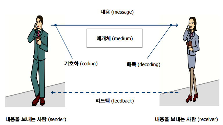 3) 채널 (Channel) : 메세지를 전달하는 수단(매개체) 또는 커뮤니케이션에 참여하는 당사자와 그들의 위치 및 순서의 양상을 의미.