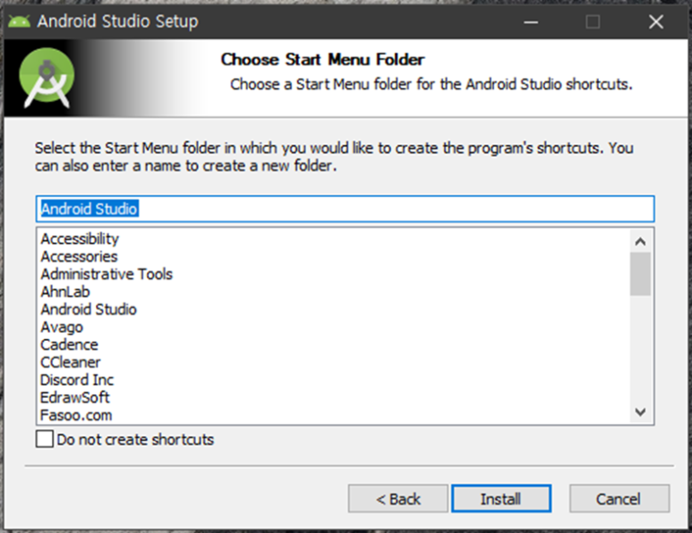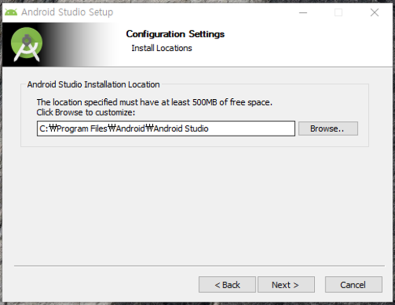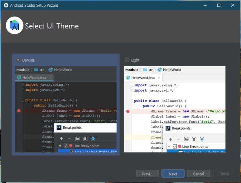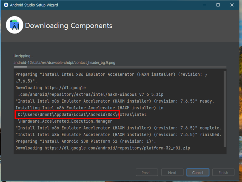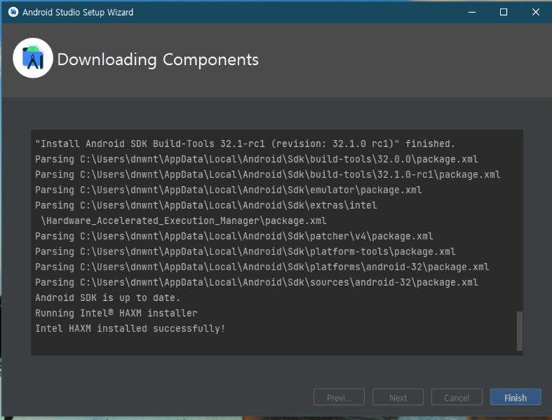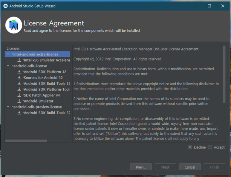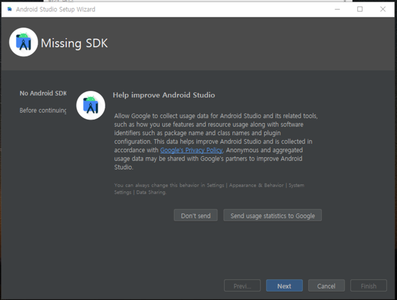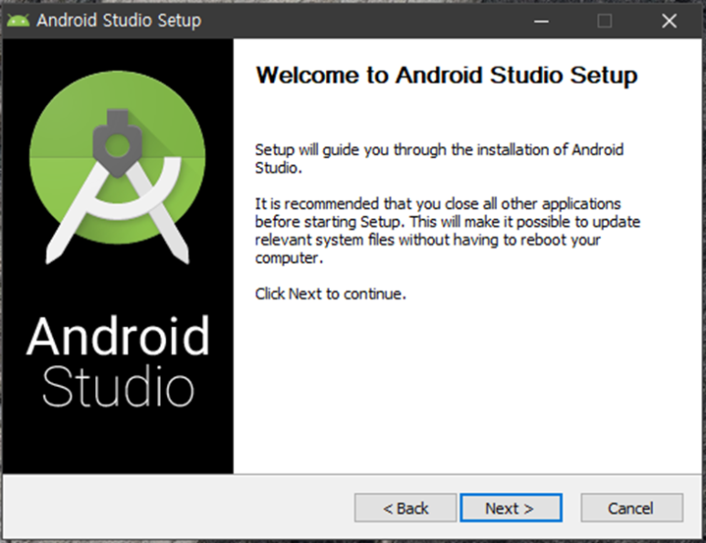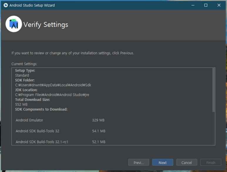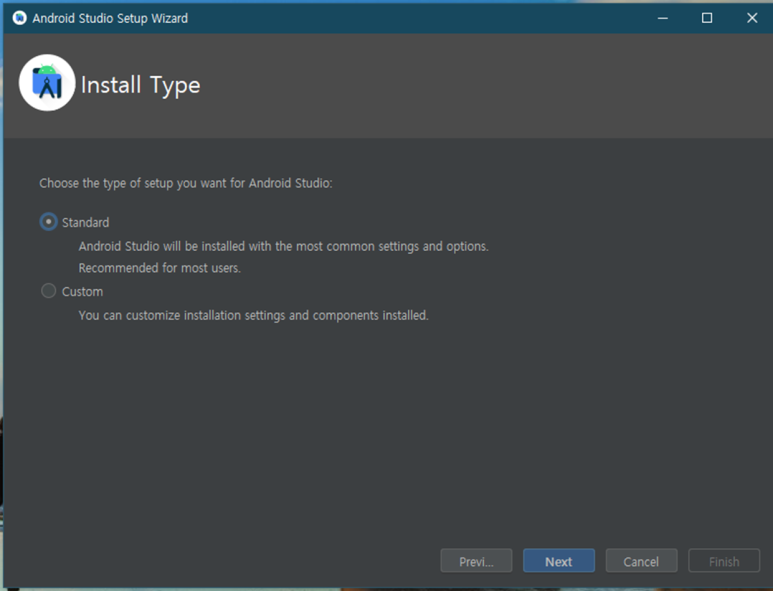 3. 안드로이스 스튜디오 설치가 완료되고 실행하면, 기본적인 환경 세팅을 하게 된다.