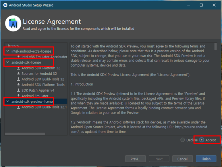(아래 크게 3가지 항목에 대해 Accept 해주면 된다.)