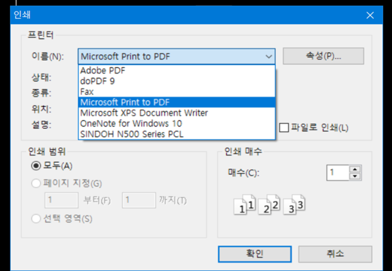 Microsoft Print to PDF 를 선택해 출력해준다.