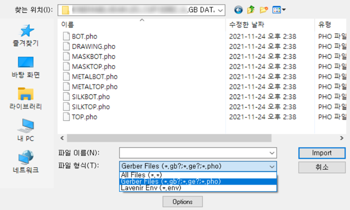 3) 파일 창이 뜨면 형식을 All -> Gerber로 변경하고 원하는 Data를 선택한다.