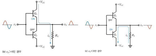 P.S : 실제 BJT 는 Vbe 0.7V 를 가짐으로 출력파형에 교차왜곡이 발생한다.