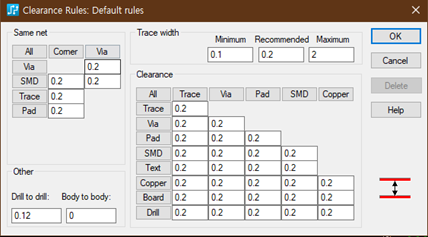 Clearance 는 Pattern 과 Pattern 사이의 간격, Pattern 두께, Pad 간 간격 등에 관한 Rule 을 설정하는 것이다.