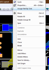 간단하게 Assign 하는 방법은 Shape 를 선택한 뒤 마우스 우 클릭을 하고, Assign Net By Click 을 선택하고 나서, Assign 하고 싶은 Net 을 선택해주면 된다.