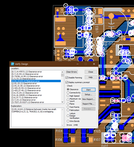 또한 PCB Data 상에 Error 가 있는 위치를 동그라미로 표시해주며, Error 내용을 지우고 싶다면, Clear Errors Button을 선택하면 된다.
