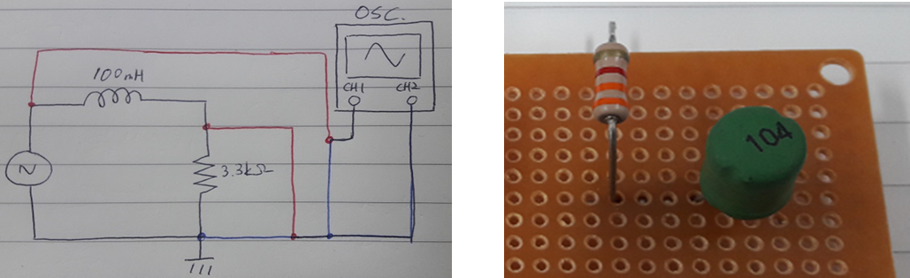 1) 하기 회로(R-L 직렬회로)를 만능기판에 꾸민다.