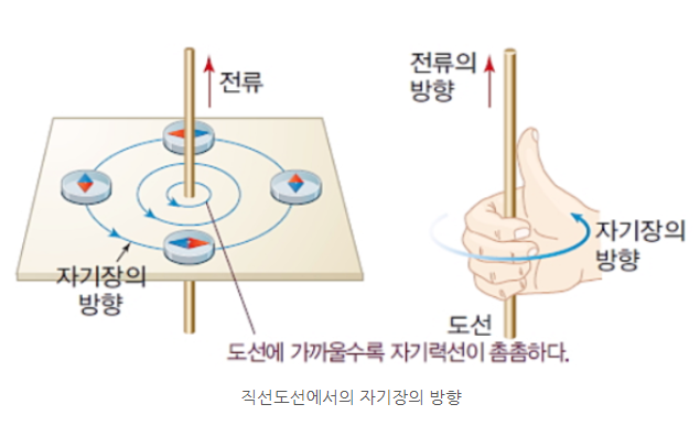 - 도선의 중심축상에서 자기장의 방향은 도선을 통해 흐르는 전류의 방향에 의해 결정.