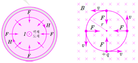 - 원통 단면을 갖는 액체 도체에 전류를 흘리면 전류의 방향과 수직 방향으로 원형 자계가 생겨 전류가 흐르는 액체에는 구심력의 전자력이 작용.