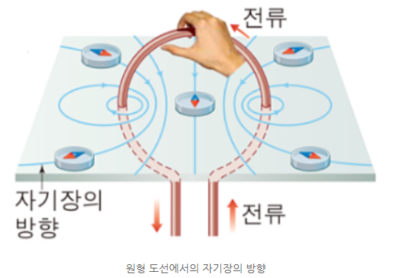 3) 엄지손가락을 전류의 방향으로 펴고, 나머지 손가락들을 도선을 감싸는 방향으로 구부리면, 나머지 손가락들이 가리키는 방향이 도선 주위의 자기장 방향이 됨.