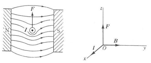 - 힘의 크기는 전류 I, 도선의 길이 ℓ, 자속밀도 B에 비례하며, 전류의 방향과 자계의 방향이 형성하는 각도를 θ라고 하면, $F=IBlsin\theta[N]$