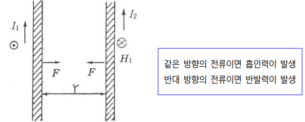 - 두 개의 평행도선에 전류가 흐르는 경우, 한 쪽 도체에 흐르는 전류가 만드는 자계가 다른쪽 도체에 흐르는 전류에 전자을 미침 (두 개의 도선 사이에 힘 작용)