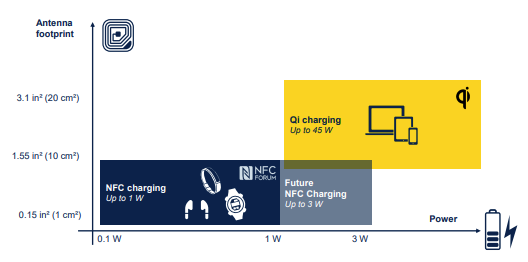 최대 1W 전력전송이 가능하며, 무선이어폰, 스마트 워치, 스타이러스펜, 위치추적태그 등의 저전력 장치를 스마트폰 및 기타 NFC 지원 장치를 통해 충전할 수 있다.